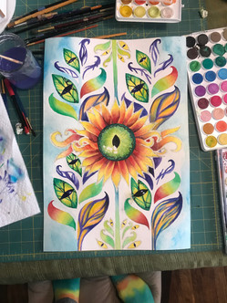 I had the idea for a cateye sunflower painting and decided to sit down and put my idea on paper. I was really happy with the results of the main sunflower and the detail in the cat eye. I was so happy with how the eye turned out that I let this sit for almost an entire year, worried I would mess the rest of the painting up. I let this sit in my unfinished paintings on top of my art cabinet so long that the masking fluid around the flower didn't want to peel off of the watercolor paper.